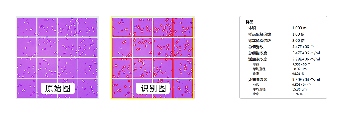 計(jì)數(shù)完成后,點(diǎn)擊數(shù)據(jù)詳情,查看細(xì)胞濃度、細(xì)胞直徑、細(xì)胞聚團(tuán)率等數(shù)據(jù)。