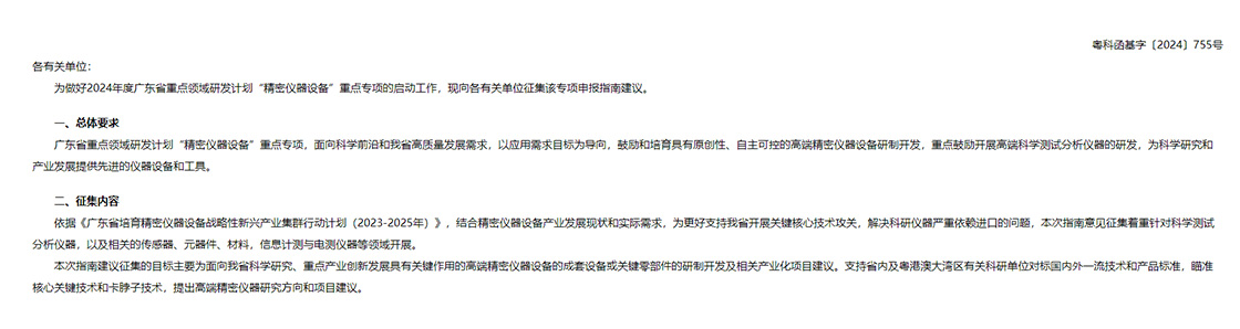 今年6月,廣東省科學(xué)技術(shù)廳發(fā)布關(guān)于征集2024年度廣東省重點(diǎn)領(lǐng)域研發(fā)計(jì)劃“精密儀器設(shè)備”重點(diǎn)專項(xiàng)項(xiàng)目指南建議的通知,旨在重點(diǎn)鼓勵(lì)開展高端科學(xué)測試分析儀器的研發(fā),為科學(xué)研究和產(chǎn)業(yè)發(fā)展提供先進(jìn)的儀器設(shè)備和工具。