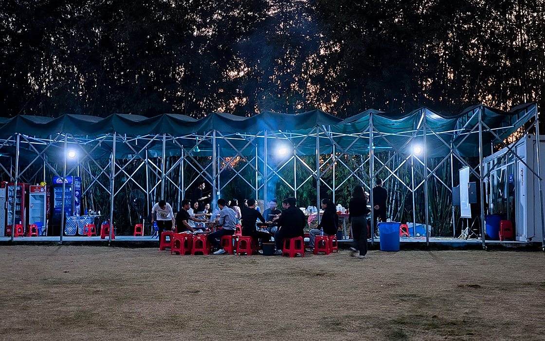 晚間,在夜光灑滿的草坪上,我們支起烤架、點燃炭火。頃之,烤肉的香氣彌漫在濕噠噠的草坪上方的空中,我們圍坐在一起,感受著煙霧繚繞中的那一份愜意。